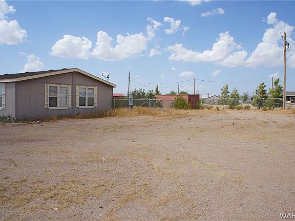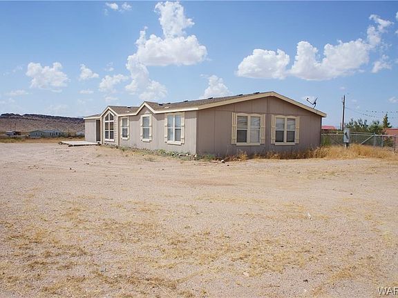 Coffee on the front deck to watch the sunrise over the Hualapai mountains. Cocktail on the back deck to watch the sunset over the Black mountains. This great 1.11 acre lot has a 4 bedroom/2 bath split floor plan with a second large living area. Lot is large enough for you to build your garage and separate in-law suite. Back yard has fence for your fur babies protection.Full size inter modal storage unit stays with the property.Washer/dryer are in the storage unit. Home needs new flooring and counter tops.