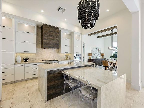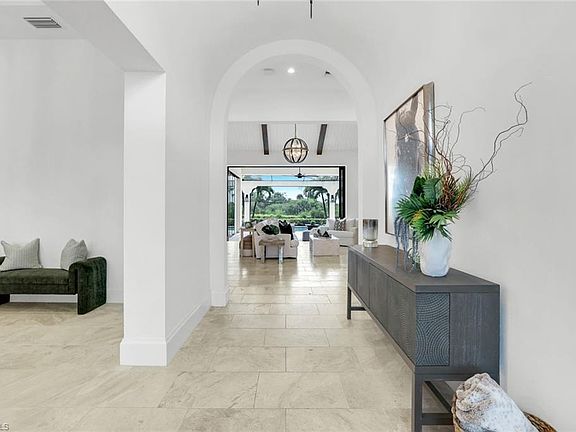 A RARE riverfront GEM with tranquil preserve, sunset views and no neighbor to one side offers unmatched privacy and natural beauty. This Stunning Santa Barbara-Style Masterpiece has Luxurious Finishes and is Highly upgraded. When you walk through the double heavy metal doors and through the arched foyer you are met with 12- and 14-foot beamed and shiplapped ceilings, small artfully placed LED lights and chandeliers illuminates the stunning upgraded marble flooring. Rich hardwood floors in all bedrooms add warmth and contrast, while the neutral color palette creates a serene ambiance. This renovated Kitchen has a unique T-shaped island, crafted with extra-thick Taj Mahal quartzite and a striking three-sided waterfall design, Custom European automatic cabinetry with pull-outs for appliances, a farm sink, ice maker, a gas range, Jenn-Air custom refrigerator and a built in prep area complete this dream kitchen. The adjacent dining area boasts 12-foot beamed ceilings and sliding glass doors, inviting you to step into the expansive outdoor living space. Pocketing sliding doors lead to the outdoor lanai which is a true entertainer’s paradise, where there are no worries about bug bites with the upgraded tight weave screens. Relax by the oversized saltwater pool and spa, featuring a cascading waterfall, color-changing LED lights, and breathtaking lake and preserve views. The extra-large lanai provides ample space for dining and lounging. A custom walk in wine closet with built-in shelving and designer lighting offers a sophisticated space for your collection. The primary suite is a private sanctuary, featuring multiple windows overlooking the serene preserve, hardwood flooring, and a luxurious dressing area. The spa-like bathroom is equipped with his-and-hers marble waterfall vanities, LED mirrors, touchless faucets, a soaking tub, and a double walk-in shower. The custom-designed walk-in closet is nothing short of spectacular, offering ample space and impeccable organization. All bedrooms are en suite, providing ultimate privacy and comfort for family and guests alike. Additional upgrades include Air conditioned garage, Whole Home Generator, Storm Smart Shutters, Large safe, Built in Garage storage, highly upgraded storage and cabinetry in the laundry room and Hunter Douglas Blinds throughout. You have the option of putting in your own private boat dock in your backyard and enjoy fishing steps from your home.This one-of-a-kind home blends timeless elegance with contemporary luxury. Fiddlers Creek offers a Beach Club, Boating Club and Golf. An immediate golf membership is available to purchase at the Fiddlers Creek Golf and Country Club with 100% equity, fully refundable—enhancing the lifestyle that awaits in this premier Naples address. Come experience timeless luxury just minutes from Marco Island and Naples 5th Avenue. .Schedule your private showing today and experience it for yourself! Low Transferable Flood Insurance! CDD is PAID!