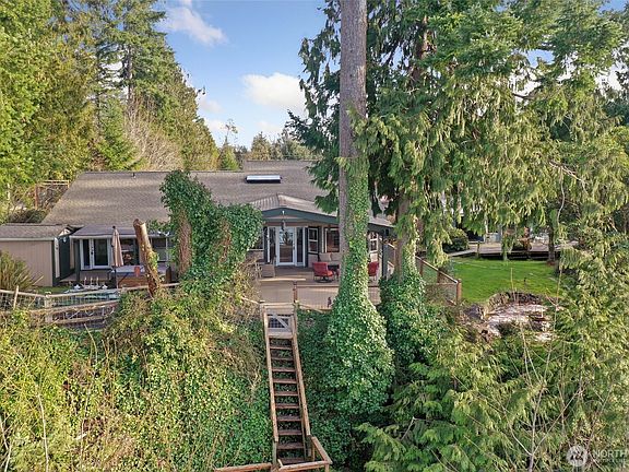 Enjoy BREATHTAKING views of Dana Passage and access to 65’ of stunning private waterfront and tidelands from this waterfront rambler with 2 bd + office (can also be used as a BR)+ an extra finished room. Soak in the views inside through the expansive windows looking out from the open floor plan, or from the large covered deck for great entertaining-or maybe from the hot tub on that cool evening while watching the sunset! Home features primary BD w/a walk-in tub and shower, beautiful granite in kitchen with eat-in bar, hickory wood floors and vaulted ceilings w/skylights in living room. There is a spacious mud room off of the garage w/sauna, and finished flex room above garage. Large level front yard w/gardening area and plenty of parking!