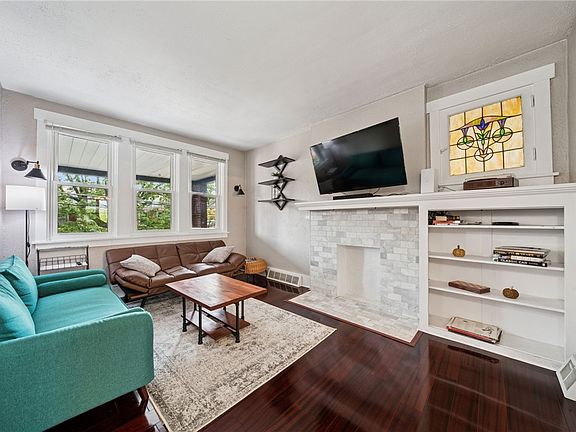Custom-built fireplaceBuilt-in shelvingNew light fixturesHigh quality craftsman-style trimFlooded with natural lightWood-covered front porchFenced-in back patio
