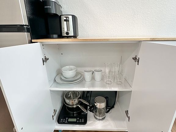 -Kitchenette: 7.5 cu ft fridge, microwave, toaster, hot plate, Keurig, cookware, utensils, dishes