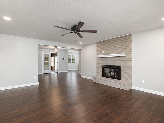 Brick fireplaceRanch-style homeMature trees adding shadeFenced backyardLarge corner lotUpdated flooring