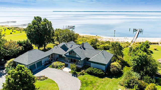 Island View: Exciting, artfully eclectic, Acorn Post & Beam home, designed to make ultimate use of huge 200 degree views with glass walls, porches, decks, expansive beach, & to enjoy the waterfront experience to the fullest. Beautifully built with lovely open floor plan and only quality materials used: Custom cabinetry throughout; Brazilian cherry, cork, tile,and slate floors; top-of-the line appliances: Granite counters in bath and kitchen, whole house audio & much more. Low maintenance landscaping adds to unique sphere of water, wind and sun.