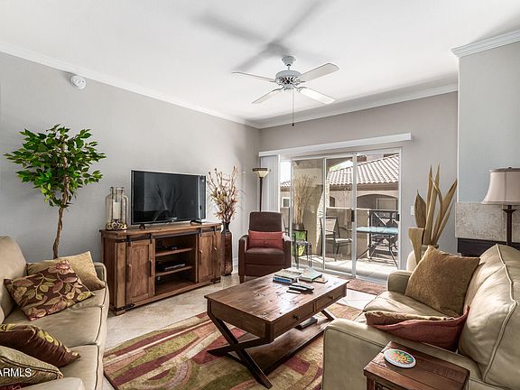 Immaculate & Highly Upgraded Corner Unit in Mountain Canyon. Move-in ready 3-bed, 2-bath condo in the sought-after resort-style community of Mountain Canyon in Ahwatukee. This open floor plan features mountain views and can be configured as two primary suites plus a third bedroom with a private balcony. Upgrades & Features: 20'' diagonal tile throughout, crown molding, 5'' baseboards, plantation shutters, two-tone paint, soft water system, spacious laundry room, 2-car attached garage, two balconies, and a cozy fireplace. Kitchen: Granite countertops, pendant lighting, ample cabinetry with hardware and under-lighting, stainless steel appliances, and a large pantry. Primary Suite: Spacious with a walk-in closet. Condo has lots of natural light! Furniture available for sale separately. HOA authorized 3 month min for short term rental of this condo. Experience resort-style living in this vibrant community with multiple pools, a spa, and a fully equipped fitness center. Conveniently located near freeways, hiking and biking trails, top restaurants, shopping, and entertainment. In addition to the two complex pools and gym, enjoy full access to Mountain Park Ranch amenities, including three community pools and spas, playgrounds, and volleyball and basketball courts.