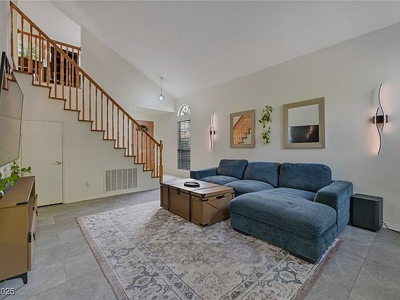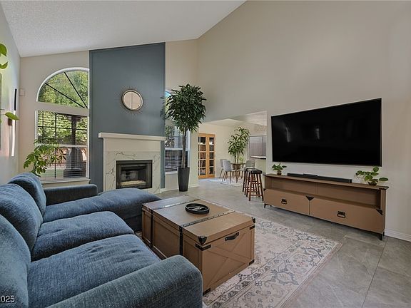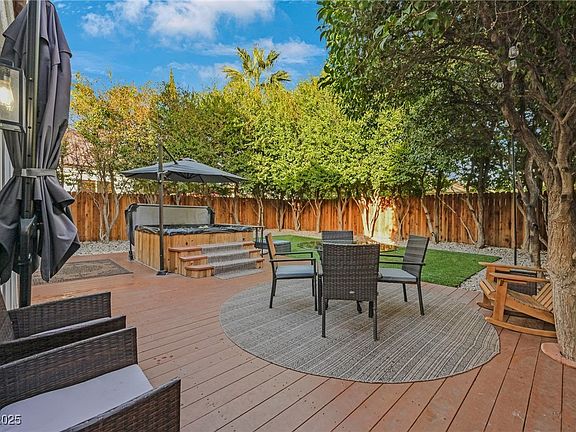 SUPER CLEAN LAKES BEAUTY! Welcome home to this warm, welcoming retreat featuring a perfect blend of tile and hardwood flooring throughout. The spacious living room offers vaulted ceilings and a cozy fireplace, highlighted by a dramatic floor-to-ceiling accent wall that draws you toward your own backyard paradise. Step outside to total privacy surrounded by mature trees, a new jacuzzi, a large stained deck, 2 collapsible swiveling umbrellas creating the ideal spot for relaxing or entertaining. The kitchen is beautifully finished with rich cherry cabinets, matching appliances, and a convenient air-fryer/microwave combo. Head upstairs to a charming loft leading to the primary suite, featuring a stylish barn-door entry, tile rain shower, and thoughtful touches throughout. The second bedroom includes a custom closet and sits right next to a full bath. All of this is tucked inside one of the happiest neighborhoods in The Lakes just minutes from everything you’ll love about Las Vegas living.
