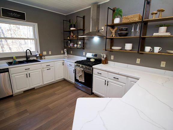 painted cabinets, new light fixtures, updated shelving, new paint, a new stainless steel refrigerator,