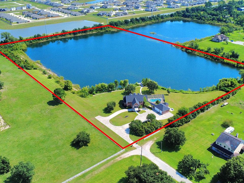 One of a kind picturesque Texas ranchette on over 15 acres with an additional 13 acres available next door. Located at the end of the cul-de-sac this custom built home showcases the best of Texas living. Peace & privacy with a close commute to Houston, Pearland, Galveston & more. Home backs up to a private lake which the seller believes is spring fed due to crystal clear water & consistent water level. The roughly 22 acre rock banked stocked lake is shared with one neighbor. The home features 4/5 beds, 5 full baths, office, game room, formal dining room, living room w/ breakfast area, a large backyard covered patio. Screened swimming pool, floating dock/pier on the lake, 3 car oversized garage, about 3 acres of yard, marble tile, high ceilings, primary bedroom on 1st floor, huge driveway w/ extra parking for RV. Fully fenced 13 acre lot next door has a smaller pond, about 11 acre pasture with a 4 stall horse barn. Both properties have high elevations putting them out of the flood zone.