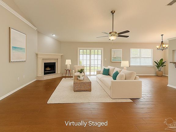 Welcome to this spacious 1,900 sq ft brick ranch-style home, offering both comfort and convenience. The open floor plan features cathedral ceilings in the living room, highlighted by a cozy corner gas fireplace. The kitchen includes a breakfast bar, a generous dining nook, and a formal dining area—perfect for entertaining. The master suite offers a walk-in closet and a private bath with a relaxing tub and separate shower. The second bedroom features a double closet, providing ample storage. A large laundry room/pantry is conveniently located just off the dining nook for added functionality. Tile flooring runs throughout the home, with portions upgraded to elegant porcelain tile. Recent updates include a roof installed just 2 years ago and a 3-year-old HVAC system, ensuring peace of mind and energy efficiency. Step outside to enjoy the privacy-fenced backyard with a covered deck—your personal oasis for relaxing or hosting guests. Additional features include a pull-down attic for extra storage. Ideally located near NAS Pensacola, Corry Station, historic downtown Pensacola, and the beautiful emerald beaches, this home blends everyday ease with coastal charm. Property is being sold as-is, presenting a great opportunity to make it your own. Some photos have been virtually staged to help showcase the home's potential. A transferable termite bond is also included.