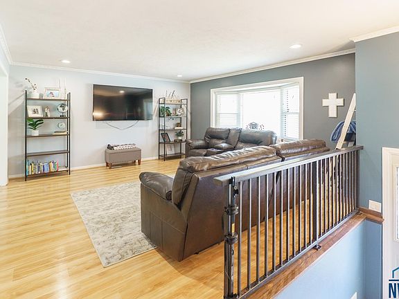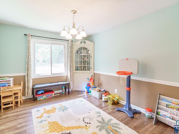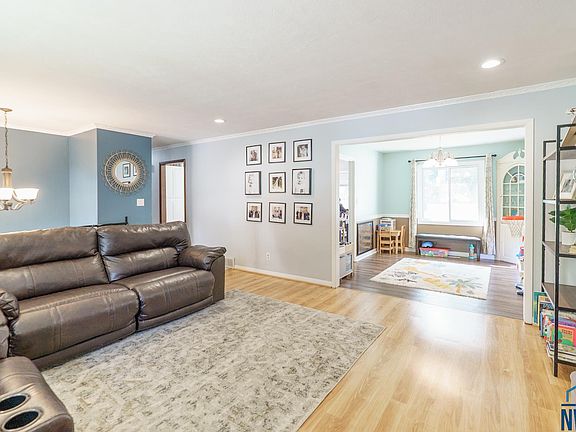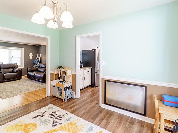 Brick accentFormal diningWhite trimLaminate floorsCrown moldingNeutral carpetingLevel backyard