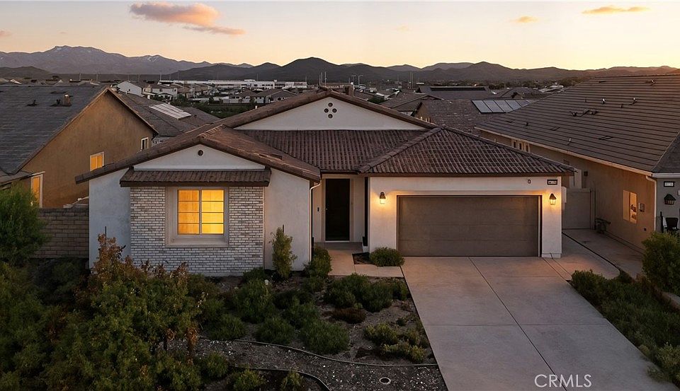 Welcome to Liberty at Braverde, one of Menifee’s most desirable master-planned communities. This stunning Paige floor plan home sits on an over 6,000 sq. ft. lot and blends style, comfort, and functionality. Featuring a private study, 2-car garage, indoor laundry room, and thoughtful upgrades throughout. The main living areas include designer chevron tile flooring, while bedrooms offer plush, upgraded carpet. A premium electrical package with custom lighting and solar ensures efficiency and elegance. The chef’s kitchen highlights quartz countertops, a chevron backsplash, deluxe appliances, a walk-in pantry, and an extended center island, opening to a spacious living and dining area with a custom floor-to-ceiling fireplace. The primary suite offers a spa-inspired bath with dual vanities, a soaking tub, a walk-in shower, and a large walk-in closet. Community amenities include walking trails, parks, open green spaces, and family-friendly gatherings, all within minutes of top-rated schools, shopping, and freeway access.