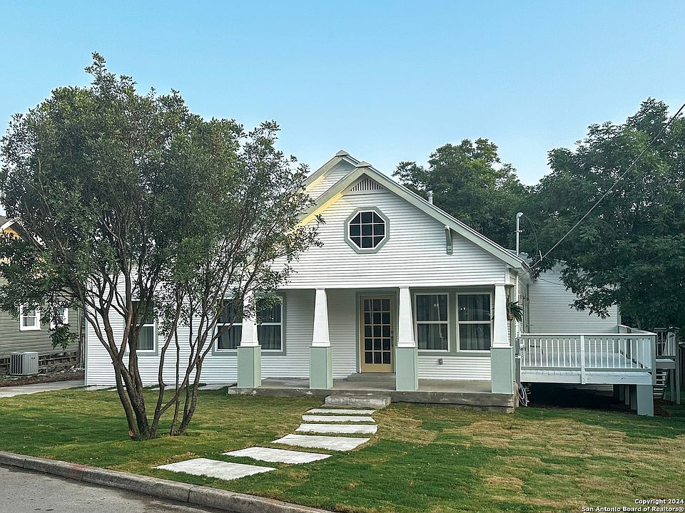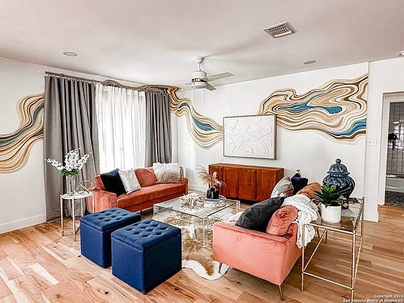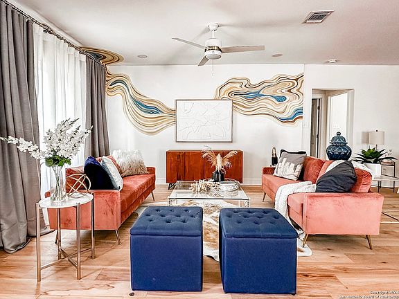 Your new home features a stunning open floor plan, unlike any space you've seen before!!! The custom kitchen will stop you in your tracks upon entry, spanning 25 feet. Featuring a 10-foot waterfall island and quartz countertops throughout, you'll also notice the custom cabinets, backsplash, range hood and new appliances. There's even a beverage cooler and serving window for entertaining on the deck. French doors lead out to your massive deck, which completes your hosting extravagance. Inside, the living area is massive, and features a custom mural commissioned through a local artist. The primary suite is bathed in sunlight, and its large size allows for an additional sitting area. The primary closet is a show-stopper, featuring a chandelier to complete the luxurious look. French doors to the primary bathroom give you the feel of entering a spa, and the space won't disappoint. Gorgeous tile lines the entire back wall, leading into your large shower with three heads to choose from. The double vanity anchors the space, with plenty of room on either side to customize to your needs. The laundry room is conveniently located between three of the bedrooms, all of which are oversized and unique. The second full bathroom features high-design tile, complementing the clawfoot tub, and classic plumbing fixtures. You won't see anything like it! The fourth bedroom is perfect as an office with incredible natural light, and the third full bathroom is conveniently located just off the living area. Adding in the classic character outside, the new sod, and massive storage above the front patio, this home has it all!