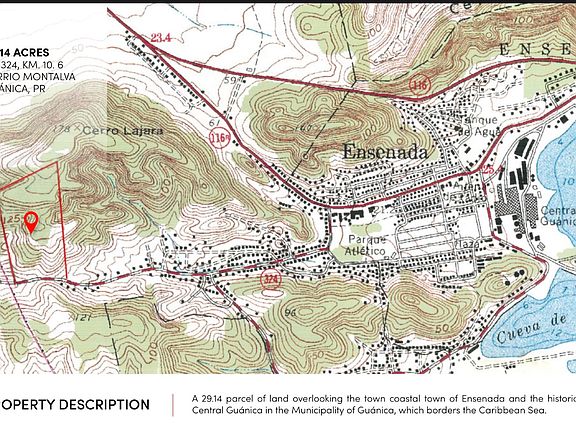 Discover Your Vision on 29 Acres in Guanica Priced at $1,100,000, this exceptional opportunity awaits you in the beautiful hills of Cerro Lacana, Guanica. This expansive 29.14 acre parcel of land is a blank canvas for your dream project. Imagine creating a stunning private estate, a sustainable agricultural venture, or an eco-tourism retreat. Zoned R-0 (Rural), this property offers incredible flexibility for a wide range of uses, including: -Development of Single-family residences -Agricultural operations -Eco-tourism initiatives -Conservation and preservation -Private estate development Located in a region known for its natural beauty and proximity to the coast, this land offers the perfect blend of tranquility and accessibility. Depending on where you build, you can capture breathtaking panoramic views of the surrounding landscape. Don't miss the chance to own a significant piece of paradise in Guanica. This is more than just land; it's the foundation for your future. For more information or to schedule a private viewing, listing agent.