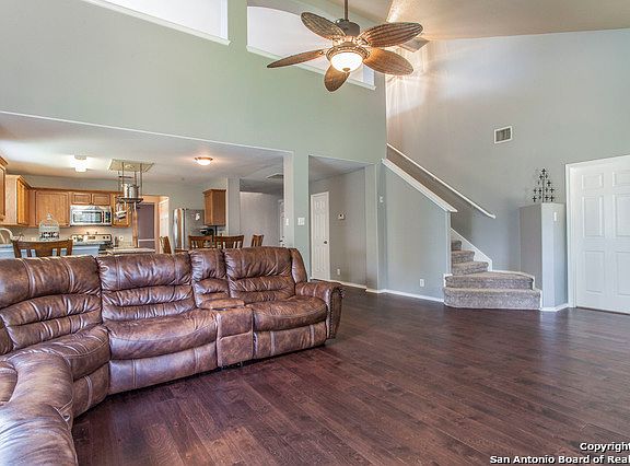 Stop the car, this home is for you. Large home with open style floorplan. Newly installed granite, wood floors, new carpet, and freshly painted interior. Kitchen opens to the living room making it perfect for family gatherings. Large living area w/ high ceilings. 3 spacious bedrooms upstairs and a huge gameroom, well suited for a pool table, tv, sitting area. Nice backyard with covered patio. Master suite downstairs. Close to IH35 & Randolph AFB. Walking distance to Steele HS. Home w/ room for everyone!