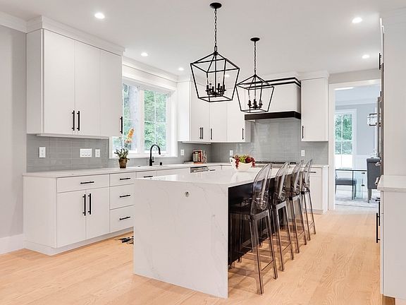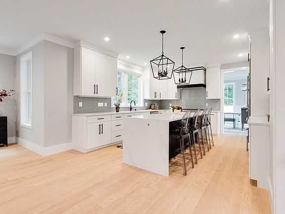 Modern, beautiful new construction w/ 9' high ceilings is less than a mile to Needham Heights train, Mitchell Elem & High School. Lg stone front entry welcomes you to home w/ bright, white kitchen w/ Thermador appliances, gas cooking vented out and waterfall quartz countertops. Family room w/ gas fireplace has wall w/ sliders to large stone private patio w/ outside gas line for grill in fully fenced in yard. Dining room has extra lg windows. Versatile living room could also be office/ 1st fl BEDROOM as there is a FULL BATH ON FIRST FLOOR! Primary suite has double walk in closets, vaulted ceiling, soaking tub, massive shower & double vanity. Jr primary suite also has vaulted ceilings w/ full bath.Two add'l bedrooms, another full bath & laundry round out 2nd floor. Finished basement has bedroom, bath, fam. room & work out area. Walk-up attic prepped to finish. Highly rated schools and great commuter location!