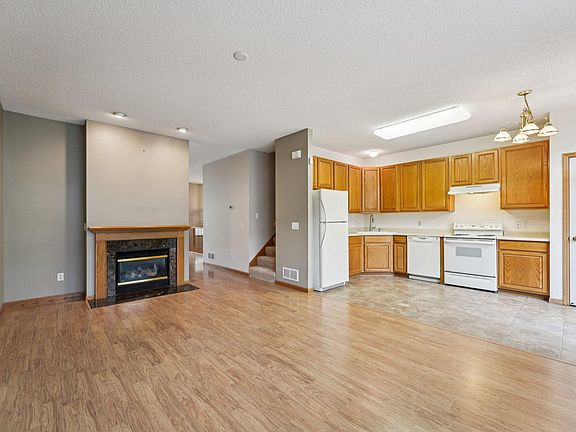 Beautifully maintained 3-bedroom, 2.5-bath townhouse near Golden Lake! This spacious home offers a huge living room and a formal dining room featuring a gas fireplace framed in elegant marble. The expansive primary suite features vaulted ceilings, a soaking tub, and generous closet space. Large secondary bedrooms provide plenty of room for everyone. The lower level offers great potential to finish for an additional bedroom and bath, adding instant equity. Enjoy an oversized 2-car garage, freshly painted half bath, owned water softener, and community amenities including a pool. Fantastic location close to parks, trails, and Golden Lake recreation!