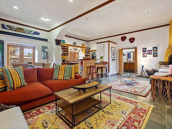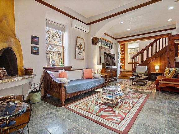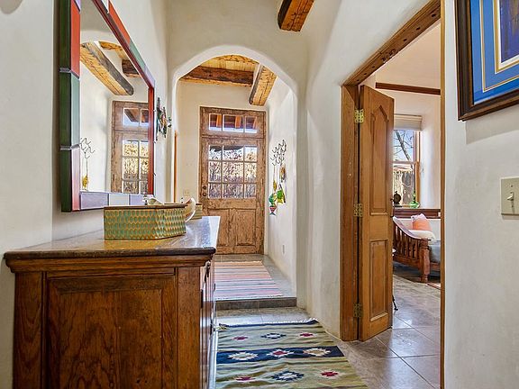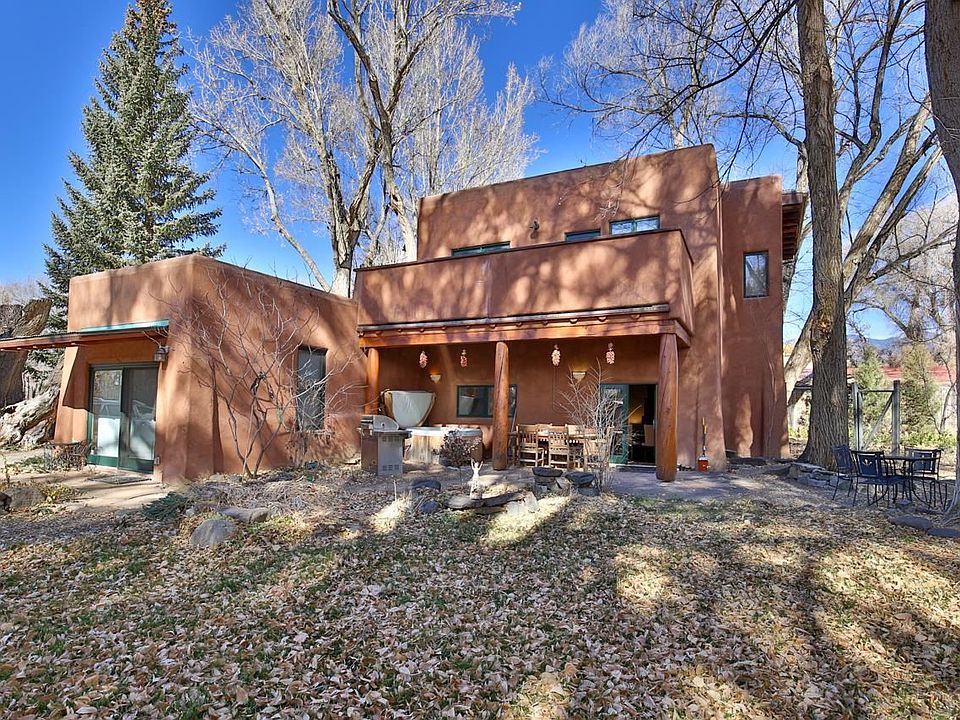 "Adobe Arboleda"...surrounded by and tucked away in a grove of majestic cottonwoods this tranquil and private in town oasis is truly a hidden treasure! Beautiful two story Pueblo style home offers a combination of Old World charm and modern comforts. Built in the early 1900s and remodeled in 2005, this exquisite adobe boasts of tasteful architectural details, quality finishes and appointments throughout providing elegance, efficiency and comfort. From the foyer, custom doors invite you in to the living, dining, kitchen area...the heart of the home! Abundant natural light and kiva fireplace create the perfect ambience for gatherings or staying warm by a fire. French doors lead to a covered portal perfect for dining al fresco or a soak in the hot tub for après ski relaxation or star gazing. Guest bedroom suite with access to the backyard is perfect spot to enjoy a cup of java! Spacious upstairs primary suite with gas fireplace and private balcony provide the perfect retreat to relax and unwind. Radiant floor heat, 3 Mitsubishi A/C units, insulated window coverings and stackable LG washer/dryer are a few of the other amenities. Fully fenced beautifully landscaped yard with lawn, flowers and mature trees provide several outdoors spaces to be enjoyed. Separate fenced area for your four-legged friends or garden to grow. Electric gate for privacy on .283 acre, natural gas and town utilities. Conveniently located blocks from Taos Plaza in desirable Kit Carson corridor across from El Monte Sagrado. This property is versatile..the possibilities are endless!