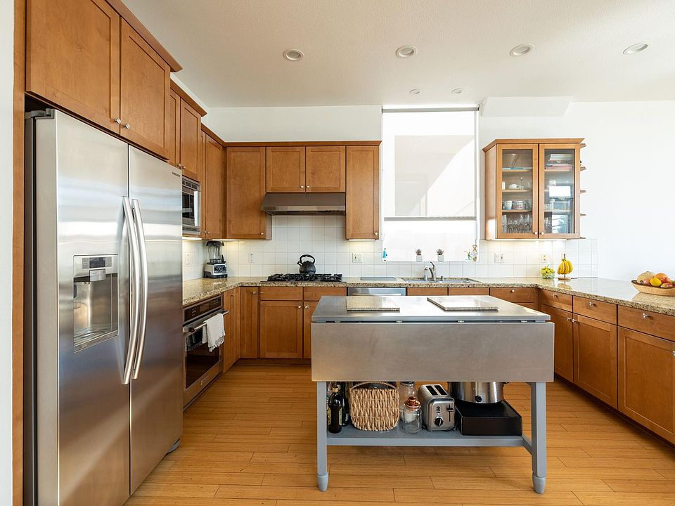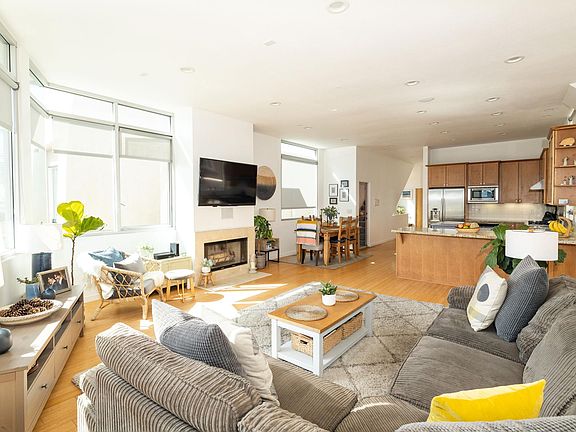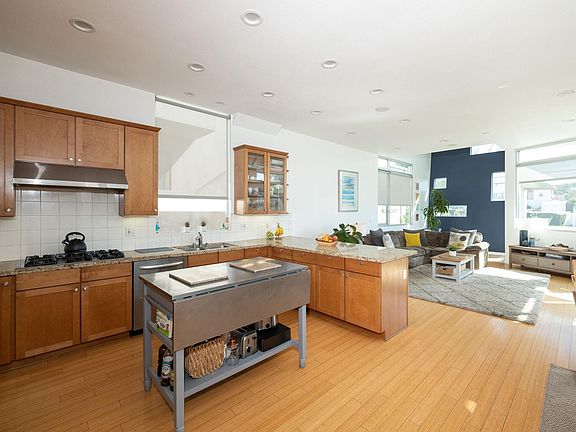 Stunning contemporary home built in 2003 with high ceilings, casement windows throughout that flood the space with natural light. Features include a roof deck with panoramic ocean views, a balcony with ocean views, and a peek-a-boo ocean view from the living room. An open floor plan with living and dining rooms plus kitchen and balcony which creates one over-sized 'great room.' Natural gas hook-ups for bbq's are installed on both balconies.Bamboo floors throughout; cabinets maple. Other amenities include stainless steel appliances, a master bath with whirlpool tub, plus a large glass- enclosed marble-walled shower. Two fireplaces, recessed lighting, ceiling fans, separate laundry room, intercom, alarm system, storage room.