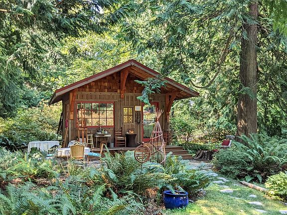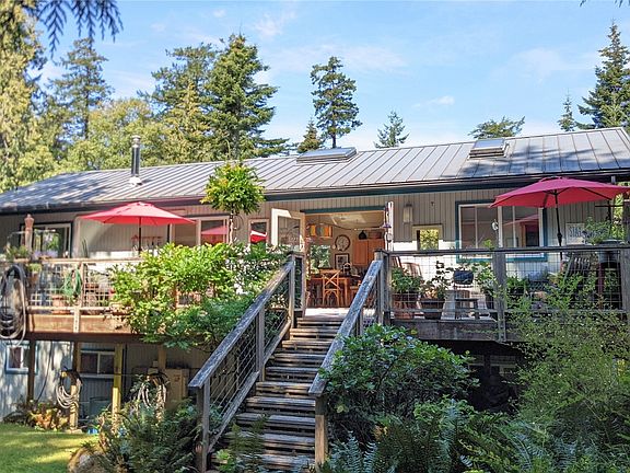 Walk to town and the beach. Private 2 bed, 2 bath home with a separate 1 bed, 1 bath apartment. Backyard cottage, straight from the pages of a fairytale book. RockIsland fiber connected. Multiple heat sources including a mini-split, propane fireplaces and radiant in-floor heat to keep you warm all winter. One acre of useable and diverse land; areas for gardening, fruit trees and a magical forest for solitude and exploration. Multiple sunny decks and mature, easy care landscaping. Quality built and maintained home with an attached 2 car garage plus workshop. Open concept main living area boasts vaulted ceilings, abundant windows, skylights, and French doors to bring nature in year round. This home is move-in ready and income producing.