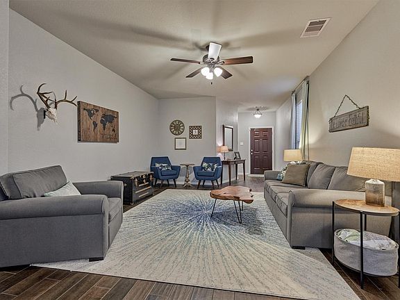Immaculate 3-bedroom, 2-bath Highland Home, perfectly situated on a spacious CUL-DE-SAC lot, ideal for play, gatherings, or gardening. This beautifully maintained ONE-STORY home offers the perfect blend of style, comfort, and functionality. The OPEN-CONCEPT floor plan is designed to maximize space and flow, creating an inviting atmosphere for both everyday living and entertaining. Elegant WOOD-LOOK TILE flooring that extends through the main living areas. Chef-inspired kitchen features a LARGE ISLAND that opens seamlessly to the family room and dining—ideal for gatherings. The primary suite is a true retreat that offers window seating, an impressive closet, an ensuite complete with dual sinks, a soaking tub, and a separate shower. Residents of Woodforest enjoy access to exceptional community amenities, including a resort-style swimming pool, a lap pool, Stampede Sportsplex for soccer, basketball courts, a lively community center, multiple parks and playgrounds, and walking trails.