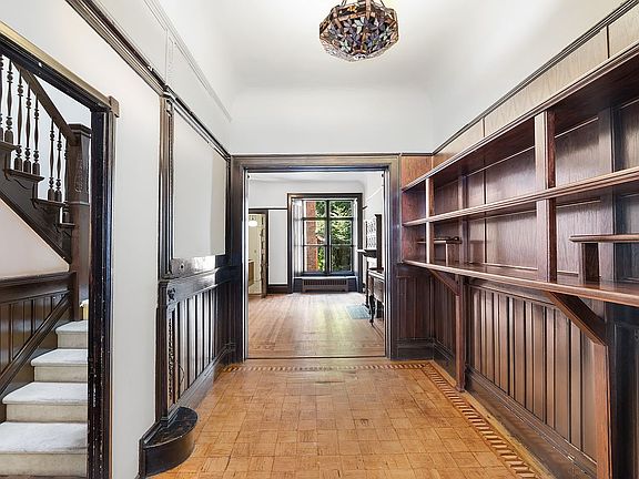 Enter through a paneled vestibule into a dramatic front parlor with soaring ceilings and exceptional natural light. The library and south facing rear living room are separated by a large original pocket door adjacent to a classic box stair that is illuminated by a large new skylight on the top floor. Past the rear living room is the expansive kitchen featuring original wooden cabinetry. A south-facing eat-in area overlooks the tranquil garden, creating many possibilities for a large chef's kitchen.