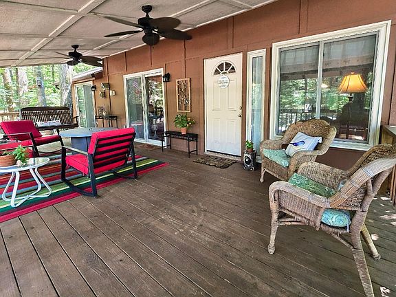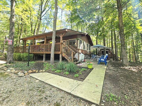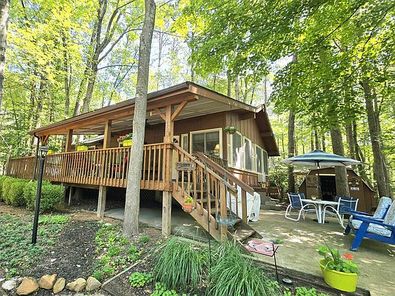 Welcome home to this wonderful 2 bedroom, 1 bath cabin in Hide-A-Way Hills. This well maintained cabin is nestled on a flat, wooded lot conveniently located near the Lodge, amphitheater, pool, tennis/pickle ball courts and Chapel in the Pines. Enjoy your morning coffee and entertaining on the large covered porch or patio. Inside the cabin features an open living concept with beamed ceilings and tons of windows to let the natural light in. Loft area is not included in the square footage. There is also a shed for additional storage.