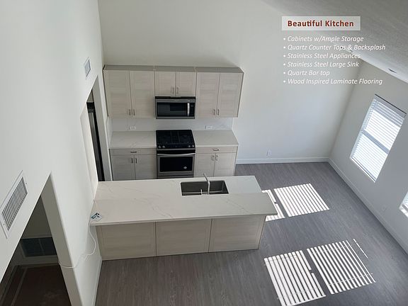 European-inspired gourmet kitchensQuartz countertopsStainless steel appliancesFull-size washer and dryerCathedral ceilingsWood-inspired laminate flooring