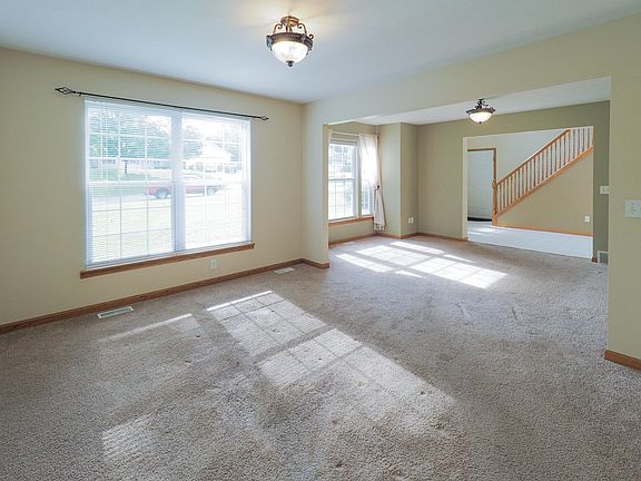 Welcome home! This 4 bedroom 2.5 bath is move in ready! Vaulted ceiling in the foyer, open concept to the family room with a gas fireplace. The kitchen has a pantry with eat in kitchen as well as a dining room opening up to the living room. Master suite comes with a jacuzzi tub, walk-in closet and a powder room. Three larger bedrooms are on the opposite end with a full family bath and laundry room. Additionally, there is main floor laundry hook up as well. The walkout basement is ready to be finished with more potential bedrooms and plumbing for additional bathroom. Two and half car garage all on a corner lot with just under an acre of land!