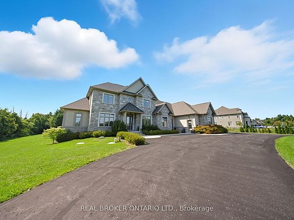 Welcome to estate living in Rural Pickering, where privacy, sophistication, and convenience meet! Tucked away on nearly 2 acres surrounded by ravines and mature trees, this executive retreat offers a rare lifestyle just minutes from the city. From the gated circular drive to the landscaped grounds, every detail speaks of refined living. Inside, over 5,000 sq ft unfolds with a seamless blend of elegance and comfort: a grand main-floor primary suite with spa-inspired ensuite, a chefs kitchen with granite counters, premium appliances, walk-in pantry and breakfast nook, plus formal dining and living rooms accented with custom millwork and soaring ceilings! Designed for both everyday living and unforgettable entertaining, the home features a four-season sunroom with heated floors, a custom theatre, built-in surround sound, and a finished basement with recreation and games rooms. Outdoors, evenings come alive under the pergola with built-in BBQs and oven - the perfect setting for gatherings that linger into the night. Practical luxury completes the experience with a heated 4-car garage, integrated security with cameras, reverse osmosis water system, and countless smart upgrades throughout! More than a home, this is a private retreat, a gathering place, and a statement of lifestyle. Welcome to estate living in Pickering!