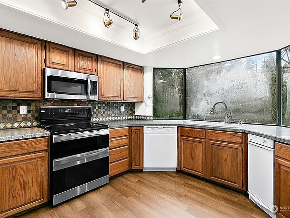 Spacious and versatile, this multi-level 5 bedroom, 3.5 bath home boasts 3670 sq ft of comfortable living space located in the desirable neighborhood of West Campus. With an elegant formal living room and cozy family room on the main level, there is plenty of space for entertainment. Fresh interior paint with two gas fireplaces. The finished basement includes a wet bar and the potential for a second kitchen, making it the perfect place for hosting guests with its ideal mother-in-law suite setup. Separate entrance. The lot backs to a serene green belt, providing ample privacy and tranquility. This is a must-see property with endless possibilities. Easy access to I-5, the Commons Mall and restaurants.