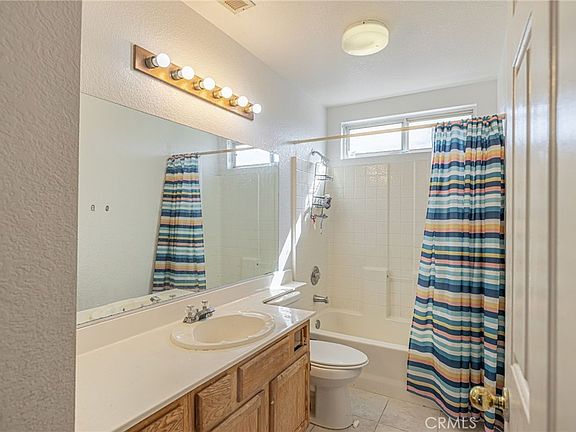 Nestled in sunny California, this two-story abode features a sprawling downstairs living and dining area that spills out onto a covered porch. Upstairs, a private balcony offers a serene retreat. Boasting three bedrooms and two bathrooms, there's ample space for relaxation. Outside, a shimmering pool with a jacuzzi awaits among lush palm trees. Solar panels and a recently replaced roof ensure eco-friendly living, while a grand two-sided staircase makes for a striking entrance.