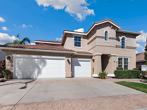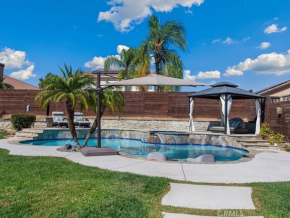 Welcome to this dream pool home, perfectly situated on a spacious lot of over 10,000 sq ft! Enter into vaulted ceilings and abundant natural light, complemented by wood shutters in family room and primary bedroom. The home features a combination of carpeting and tile flooring throughout. A large room off the entry can be used as a formal living and dining area. At the back of the home, you'll find an open kitchen, family room, and dining space. The kitchen offers ample cabinet space, Corian countertops, a tiled backsplash, new double ovens, and a huge pantry. The cozy family room is anchored by a fireplace and built-in media cubby, built in ceiling speakers, perfect for relaxing evenings. Go outside to a spacious patio covered by an Alumawood cover with lighting, fans and Bluetooth speakers, a lush grassy backyard, and a sparkling pool and spa with a waterfall and a gazebo—ideal for outdoor entertaining. The main floor also includes a bedroom/office, full bathroom, and laundry room with access to the 3-car garage. Upstairs, there are 4 spacious bedrooms and 2 bathrooms, including an oversized primary suite with a walk-in closet and an en-suite bathroom featuring dual sinks, vanity, soaking tub, and separate shower. Located within the top-rated Temecula school district with several “Choice” schools nearby, this home comes with low taxes and NO HOA. Large side yard with double gates for dog run, toy storage, or even a chicken coop! Conveniently just minutes away from Temecula Wine Country, Promenade Mall, major freeways, and resorts! Don't miss this amazing opportunity!