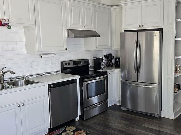 New laminate flooringLots of cabinetsStainless appliancesLarge master bedroomMaster bathQuaint covered patioNew shaker cabinets