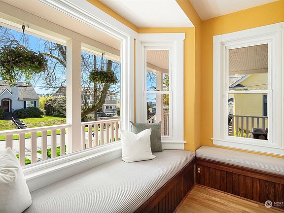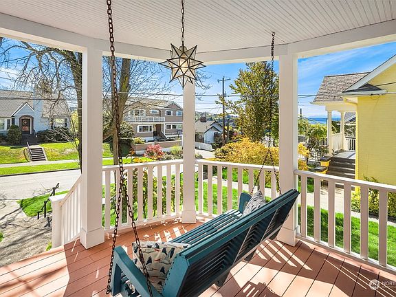 Quintessential Victorian Farmhouse in the heart of Sunset Hill. An above street lot boasts sound and mountain views from the relaxing wraparound porch. Step into 9 ft ceilings, gleaming oak floors, a bay window seat and warm fireplace in the living room. Spacious & remodeled eat-in kitchen features Wolf range, quartz counters and thoughtful pantry storage. An extra room on the main level makes for easy entertaining, an office or workout space. Two upstairs bedrooms include primary w/ full bath en suite, walk-in closet and a private view deck! The sunsets are famed here, enjoy them as a nightly ritual. Level rear yard, detached garage + 2 parking spaces off alley. Shilshole Bay & Golden Gardens/Dog Park are just mins away. Welcome home!