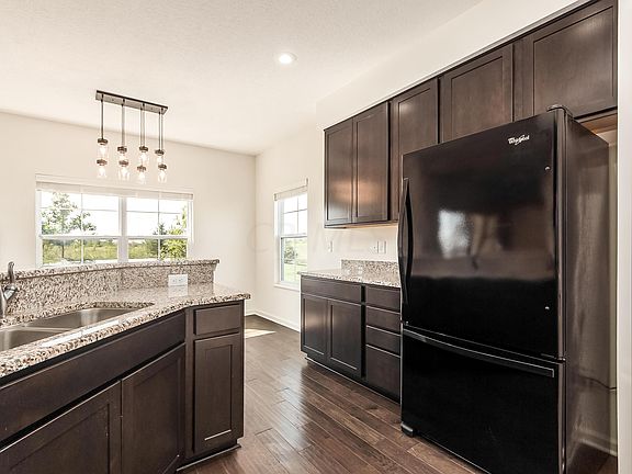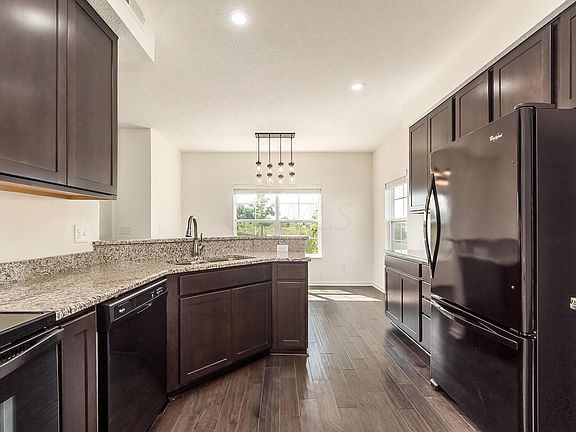 This cute end unit condo was just built in 2016 and features 2 bedrooms with walk-in closets, 2 full baths, den/home office, laundry room, and a 2 car attached garage. Gorgeous kitchen has dark wood flooring, lots of cabinets plus a pantry for storage, granite counters, sleek black appliances, bar seating, and a large eat-in area highlighted by a stylish light fixture. Wood flooring continues from the kitchen into the spacious family room with French doors leading to the patio with a relaxing view of the greenspace behind the unit. Save money on memberships with the onsite pool and fitness facilities! Great location convenient to Olentangy Liberty Schools, 270, OSU, and Downtown. All this and no exterior maintenance!
