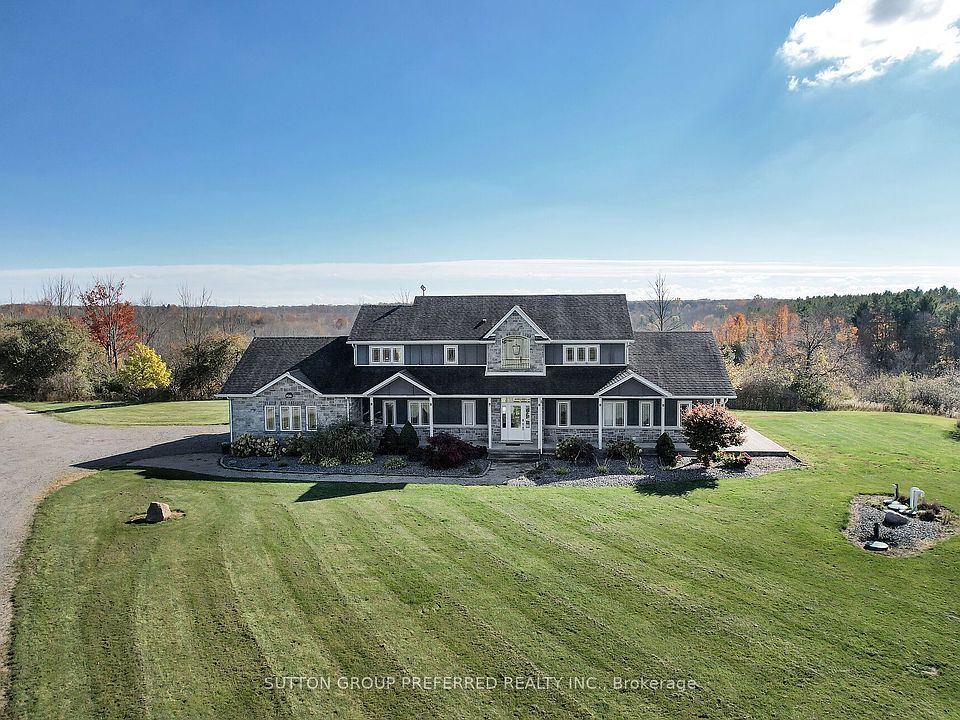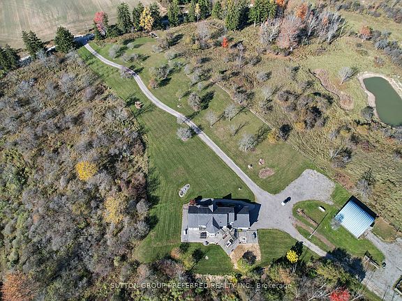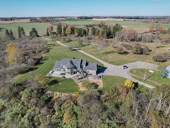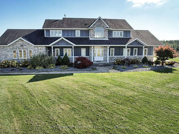 MUST SEE! Situated on almost 4 Acres this peaceful, secluded retreat with gorgeous panoramic views is ready to move in. A long winding driveway to this executive country estate with triple garage, 4 + 2 bedrooms & 4 bathrooms backs onto a forested ravine. Welcoming foyer with custom cabinets opens into an open concept layout & breathtaking views from the 2 storey wall of windows. Designer kitchen with massive island with B/I warming drawer seats 6 & has premium quality appliances including a stunning oversize fridge. Adjacent, generous, butler pantry with quartz counters, wine cooler, ice maker & lots of cupboards great when entertaining. Main floor primary bedroom with patio doors to deck & hot tub has an ensuite with soaker tub, huge dual shower, two vanities and makeup vanity & a laundry with custom cabinetry. Unique office & large landing on 2nd floor with cat walk & 3 bedrooms, one with its own balcony. Finished lower level with 2 bedrooms, rec room/ exercise area & lots or room. Huge deck overlooking treed ravine with hot tub and built in propane BBQ. The large steel Quonset hut is ideal for storage. Ample parking for those with trucks, trailers or RV's. Efficient geothermal heating & cooling. Recently hooked up to municipal water. There is egress from the 2 lower bedrooms - deck removable. The views are priceless!!