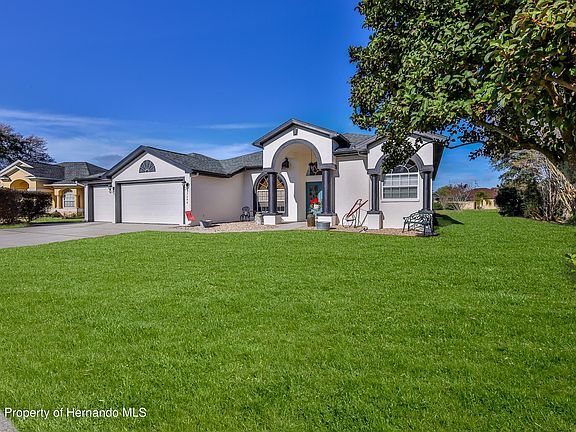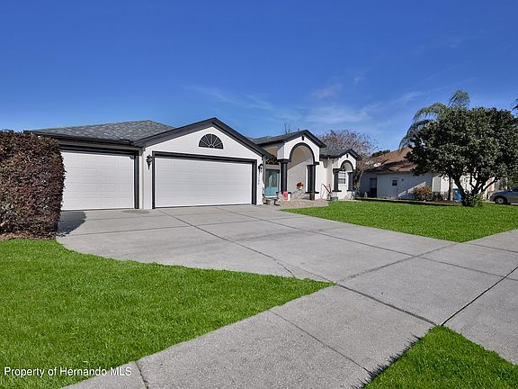 4/3/3 Pool Home located in the sought after gated community. Situated on a lovely loop there is plenty of space between you and the neighbors. Just painted Exterior & Interior. Brand new Roof, a few months old. Double entry glass leaded doors lead you into this open floor plan home. Upon entering, you have an immediate view through the glass sliders to the fantastic pool. The combination formal living & dining room features high ceilings and rounded transom windows giving natural light. The open-concept kitchen overlooks the family room with eat-in-area with mitered glass windows overlooking the pool. There is plenty of counter space (Granite) New Tile Back Splash and nook counter for additional seating and entertaining. Built in Pantry with pull-outs plus additional Closet Pantry. New Entertainment space in family room with Ship Lap wall with 75' TV (included) sits above the brand new electric fireplace. This floor plan gives the owner separate suites for the ultimate in privacy. Off the family room are two additional bedrooms that share a spacious guest bathroom. The true guest suite or home office is situated at the rear of the home with private bath and pool bath that leads to the outdoor excitement of Florida living. Master suite includes everything you need with double walk-in closets, a garden tub, walk-in shower and sliders to the lanai. Indoor Utility Room with sink, Washer & Dryer Included (Washer is less than 6 mos. Old) and it has a Window!! The location of this property is on a quiet street with a no-build area behind. The large deck that surrounds the pool has custom arches and brand new screens. There is an irrigation well, instant hot water in bathroom 3, surround sound, and radiant barrier for additional insulation. All new higher commodes, Single garage door has brand new opener, Extra Heavy Hurricane Fabric for Mitered Glass Window,) Additional Refrigerator in garage & Utility Sink in Garage. Extra large garage with attic steps. Garage doors (both) installed Dec. 2022! All of this plus a large lot with mature landscaping. Pristine Place is a gated community offering a community clubhouse and pool, tennis courts, playground and exercise room. Community is conveniently located close to shopping, dining, close to the ramp for the Parkway putting you just 45 minutes from Tampa. 45 minutes from Gulf Beaches and 20 minutes from the Hernando Beach boat ramp giving you direct GULF access. CASH OR CONVENTIONAL ONLY.