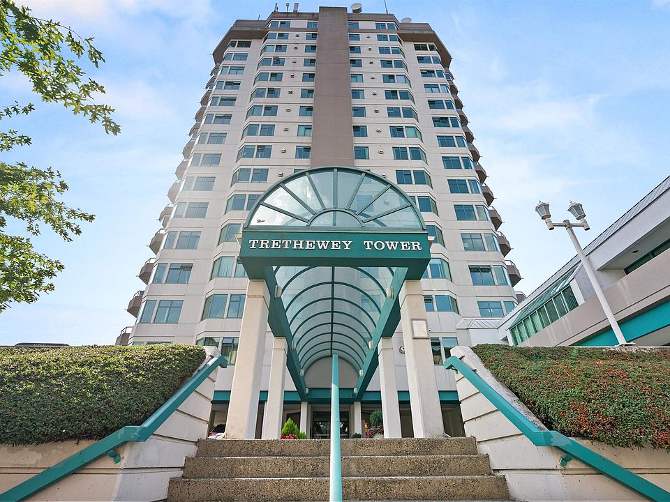 Welcome to Trethewey Tower on Simon, where uninhibited views of Mt. Baker and the North Shore Mountains set the stage. This Northeast corner unit offers two spacious bedrooms, two full bathrooms, and a fully enclosed solarium sundeck, Perfect for use all year round. Some updates are already in place—bring your ideas to make it your own! Enjoy resort-style amenities including an indoor pool, hot tub, sauna, tanning deck, fully equipped gym, craft and games rooms, library, lounge, workshop with tools, bike room, plus a storage locker. One covered parking space included. With more parking rentals potentially available. Quick possession available. The complex allows one cat, but no dogs are allowed. Beautiful built-in microwave.