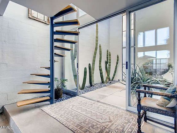 Camelback Place is a Mid-Century modern community of 14 Townhomes (LOFT) designed by AL BEADLE in the early 1970s! Soaring 17' floor to ceiling windows give a stunning Natural Light effect (Motorized Blind on East windows). Original Hanging/Free Standing Fireplace, Spiral staircase & Restored Concrete sunken living room floors preserved/updated for true period detail. Kitchen, Baths & Courtyard updated, yet Respectful of Al Beadle's vision! Kitchen upgraded w/New Quartz countertops, New glass cooktop, New SS dishwasher & New Blanco undermount Kitchen sink & faucet! (Sm 2 Drawer fridge in kitchen, Full Fridge & Full Freezer in Wlk-In Pantry) Extensive use of Art Deco tile in all the right places! Mstr Suite & Bath are stunning in everyway! (MORE)