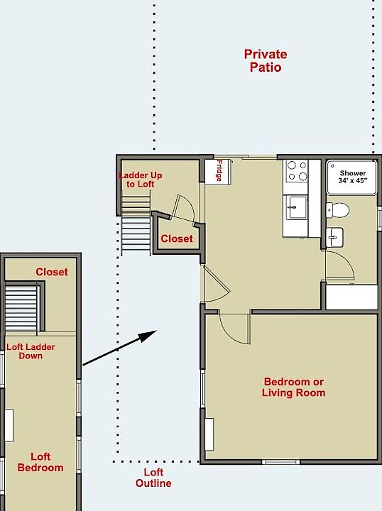 One bedroom downstairs and loft that can be used as an office, guest bedroom or whatever you like! Small fenced-in yard/patio. Large bathroom. Single kitchen/dining/living area. Parking on site. Outdoor storage shed.