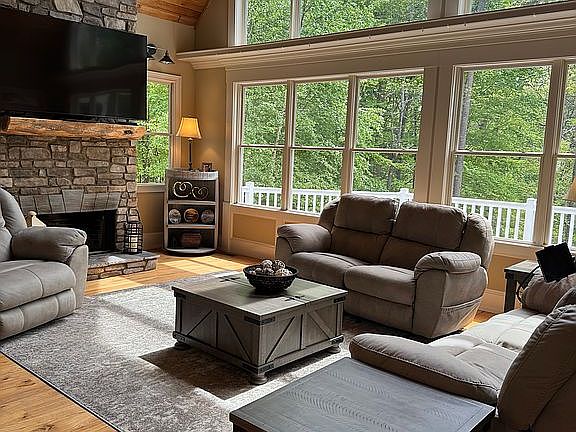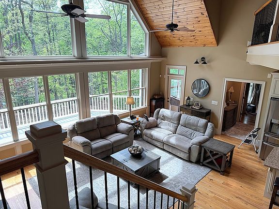 Main level includes master suite, w/ screened in porch. Living room, large windows overlooking large deck, fire pit, Lake view of the dock.