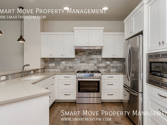 Three story town-home. End unit. Gorgeous great room high-end kitchen: stainless steel appliances, including gas range, tile and tons of beautiful counter and cupboard space. Stylish and modern hardware and fixtures. Two master bedrooms, both with walk in closets with attached baths. Third floor balcony. Washer dryer convenience items only. Two car garage with auto opener. Outside maintenance cared for by HOA. Neighborhood pool and clubhouse.