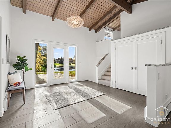 This stunning mid-century modern retreat will make you feel like you're on vacation year-round, perfectly set on over two acres of private waterfront property in the Glenview/Northbrook area. Surrounded by mature trees and lush gardens, this secluded sanctuary offers peaceful water views and four seasons of natural beauty-all just minutes from award-winning schools and a quick commute to downtown Chicago. Thoughtfully updated and meticulously maintained, the home blends timeless design with modern comfort. The welcoming foyer opens to a bright dining area and tranquil walled garden, creating a seamless connection between indoor and outdoor living. The sleek galley kitchen features flat-panel cabinetry, quartzite countertops, a custom glass backsplash, and high-end Wolf and Sub-Zero appliances. The spectacular great room is the heart of the home, showcasing vaulted ceilings, original terrazzo flooring, a gas fireplace, and floor-to-ceiling windows overlooking the raised patio, water fountain, and waterfront-perfect for relaxing or entertaining. The main-floor primary suite offers serene water views, a custom walk-in closet, and a beautifully updated bath. Upstairs, two spacious bedrooms with new carpeting enjoy panoramic views of the property, along with a second full bath and sitting area. The lower level includes a laundry room with a new washer and dryer, ample storage, and access to the two-car garage. This is a rare opportunity to own a private waterfront retreat so close to Chicago.