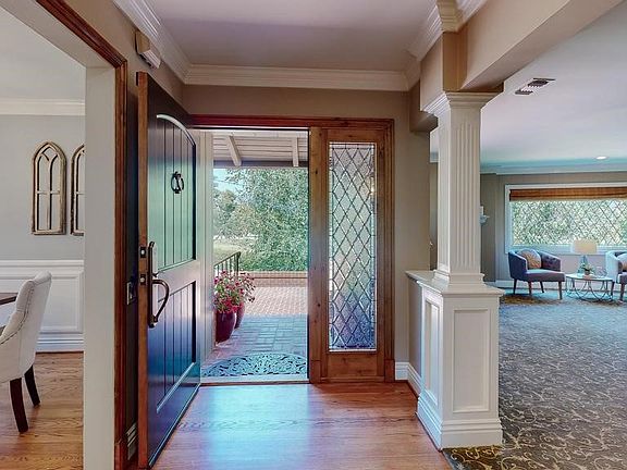 Stunning California Ranch located in the prestigious Oakmont Country Club neighborhood of the Verdugo Woodlands. Fabulous views of the Mountains and the golf course. Traditional foyer entry, rustic wood hewn doors & warm hardwood flooring throughout. Open & fluid living room presents a striking picture window w/leaded glass detail, stately columns, corner mantled fireplace & plush fleur de lis carpeting. Light filled the formal dining room is graced w/delicate wainscoting, crown molding & cornered leaded windows. A gourmand’s delight, the chef’s kitchen has a bevy of amenities. Burnished Maple cabinetry, marble countertops, six burner Viking range & hood, Viking paneled dual refrigerator-freezer, stainless dishwasher, microwave, a hammered copper sink & charming bay window. Fabulous family room w/dramatic brick fireplace, vaulted ceiling, Federal style mantle, built-in bookcases, entertainment system & a marble topped dry bar w/two beverage coolers & counter seating.