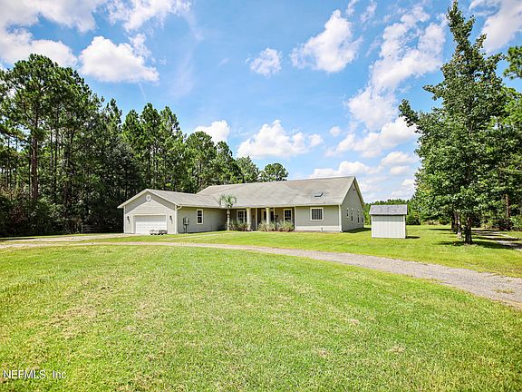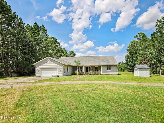 Have you been seeking a unique property with sprawling acreage, a beautiful main home, and a separate guest home? Privately nestled down a winding road on 5.79-acres, this 4BR/3BA main residence impresses with a covered front porch, vaulted ceilings, gorgeous wood floors, large living room w/fireplace, laundry room, New smart water heater, water treatment system in 2019 and an upgraded gourmet kitchen featuring all Brand New stainless-steel appliances and granite counters. Oversized for maximum comfort, the primary bedroom entices with ample closet space and an en suite. Main house has French drain in front/back. Ideal for investors or multigenerational needs,1-car garage, fully-equipped kitchen, two bedrooms, one full bathroom, and a living area. Only 9.9-miles to JAX, near I-95, and mor