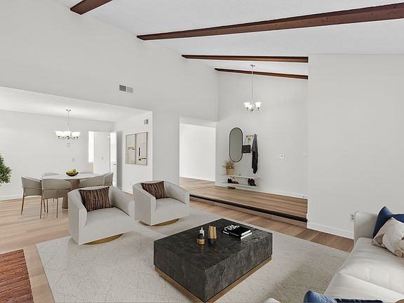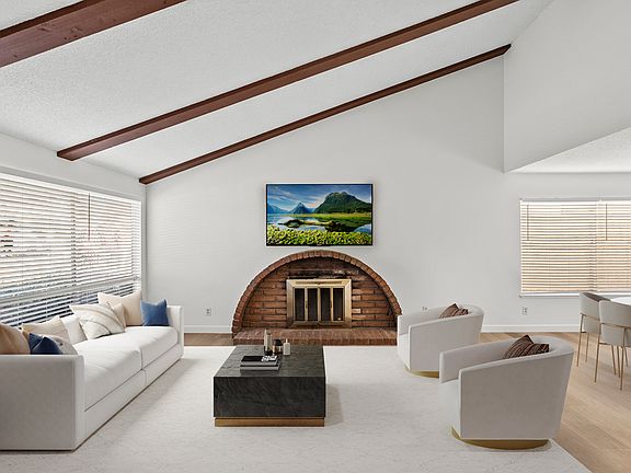 Beautifully updated 4-bedroom, 2-bath single-story home featuring vaulted ceilings, exposed beams, and a striking brick fireplace. Spacious open layout with two living areas, fresh paint, and new flooring throughout. The bright kitchen includes stainless steel appliances, ample storage, and a large window overlooking the private backyard. The primary suite offers high ceilings, mirrored closets, and patio access. Enjoy outdoor living with a patio, lush lawn, and mature trees perfect for relaxing or entertaining. Includes indoor laundry, central A/C, and an attached 2-car garage. Located on a quiet street close to parks, schools, and shopping. Move-in ready and full of natural light! No Pets.