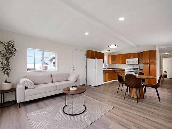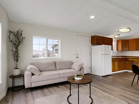 This bright and inviting 658 sq. ft. manufactured home offers 2 bedrooms and 1 bathroom in a cozy, open-concept layout. The living and dining area is perfect for entertaining or relaxing, while the kitchen features modern appliances and ample cabinet space. Both bedrooms provide generous closets, and the bathroom includes a convenient shower/tub combo. Step outside to your private yard, ideal for soaking up the California sunshine or enjoying a morning coffee.