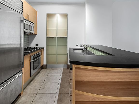The open-style chef’s kitchen is perfect for entertaining, equipped with top-of-the-line stainless steel appliances, including a Sub-Zero refrigerator, Bosch range and dishwasher, wood cabinetry with frosted glass backsplash, and absolute black granite countertops with a breakfast bar. The beautifully tiled bathroom features luxurious Kohler fixtures, and the unit comes complete with a washer and dryer for added convenience.