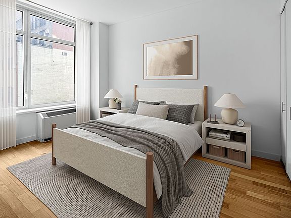 Welcome to Unit 10E at the luxurious 325 Fifth Avenue Condominium, ideally located between Midtown East and West. This stunning 1-bedroom, 1-bathroom home is designed for modern city living, featuring a spacious, open layout with oversized windows that flood the space with natural light. The apartment boasts soaring 10-foot ceilings, light oak hardwood flooring, and ample closet space, offering both style and functionality.