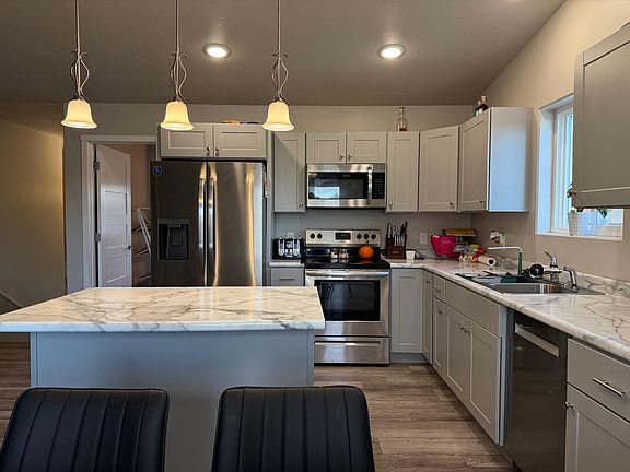 Beautiful Split-Foyer Home in Surrey’s Newest Development! Step into this nearly new 6-bedroom, 3-bath split-foyer home offering over 2500 square feet of finished living space. Built in 2021, this home shows like new but comes with many features you won’t find in comparable new construction — including landscaping, a large deck off the dining area with steps down to the backyard enclosed with a maintenance free fence. The 1284 sq ft main level features an open-concept layout with durable vinyl plank flooring, a bright living area, and a modern kitchen that flows seamlessly into the dining space and deck access — perfect for everyday living or entertaining. Three spacious bedrooms are located on the main floor, including a comfortable primary suite with a private bath. Downstairs, the daylight lower level offers a large family room, three additional bedrooms, and a full bath — providing plenty of room for guests, hobbies, or a home office. Additional features include a triple attached garage that’s insulated, sheetrocked, and equipped with a floor drain, a paid-for Vivint security system (monthly subscription required) and a desirable location in Surrey’s growing new development, close to parks, schools, and a short drive to Minot. This home combines the convenience of new construction with the extras already in place — ready for you to move in and enjoy!