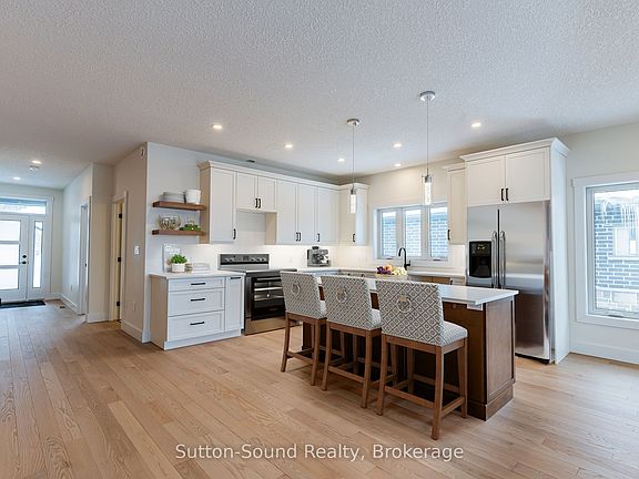 Welcome to this stunning 4-bedroom, 3-bathroom bungalow in the highly sought-after Woodland Estates. Offering 1,594 square feet on the main floor, this thoughtfully designed home features an open and functional layout with two bedrooms upstairs and two additional bedrooms in the fully finished lower level. The heart of the home is the impressive great room, showcasing 9-foot ceilings, a cozy gas fireplace, abundant cabinetry, quartz countertops, a large kitchen island, and patio doors leading to a 10' x 21' partially covered deck, perfect for outdoor entertainingwith stairs down to the fully sodded backyard. The spacious primary suite offers a peaceful retreat with a walk-in closet and a spa-like 4-piece ensuite featuring quartz counters, a tiled shower, and a freestanding tub. Convenience meets style in the main floor laundry/mudroom, complete with cabinetry and countertop workspace. Rich hardwood flooring spans the main living areas, while ceramic tile adds durability and elegance to the foyer, bathrooms, and laundry room. The lower level continues to impress with 86 ceilings, a generous family room, two large bedrooms, a full 3-piece bath, and a sizable utility/storage room. The exterior is equally impressive, wrapped entirely in premium Shouldice Stone and complemented by a double car garage, concrete driveway, and a welcoming cement walkway to the covered front porch. This move-in ready home blends luxury, comfort, and timeless design in a premier location.